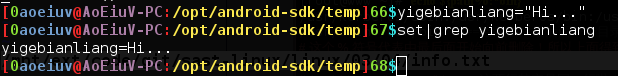 内部命令set,set可以看到所有定义了的变量,还有函数,因为太长了,所以可以用less命令看,set|less,这样set的输出就可以用上下移动,空格翻页,q退出。